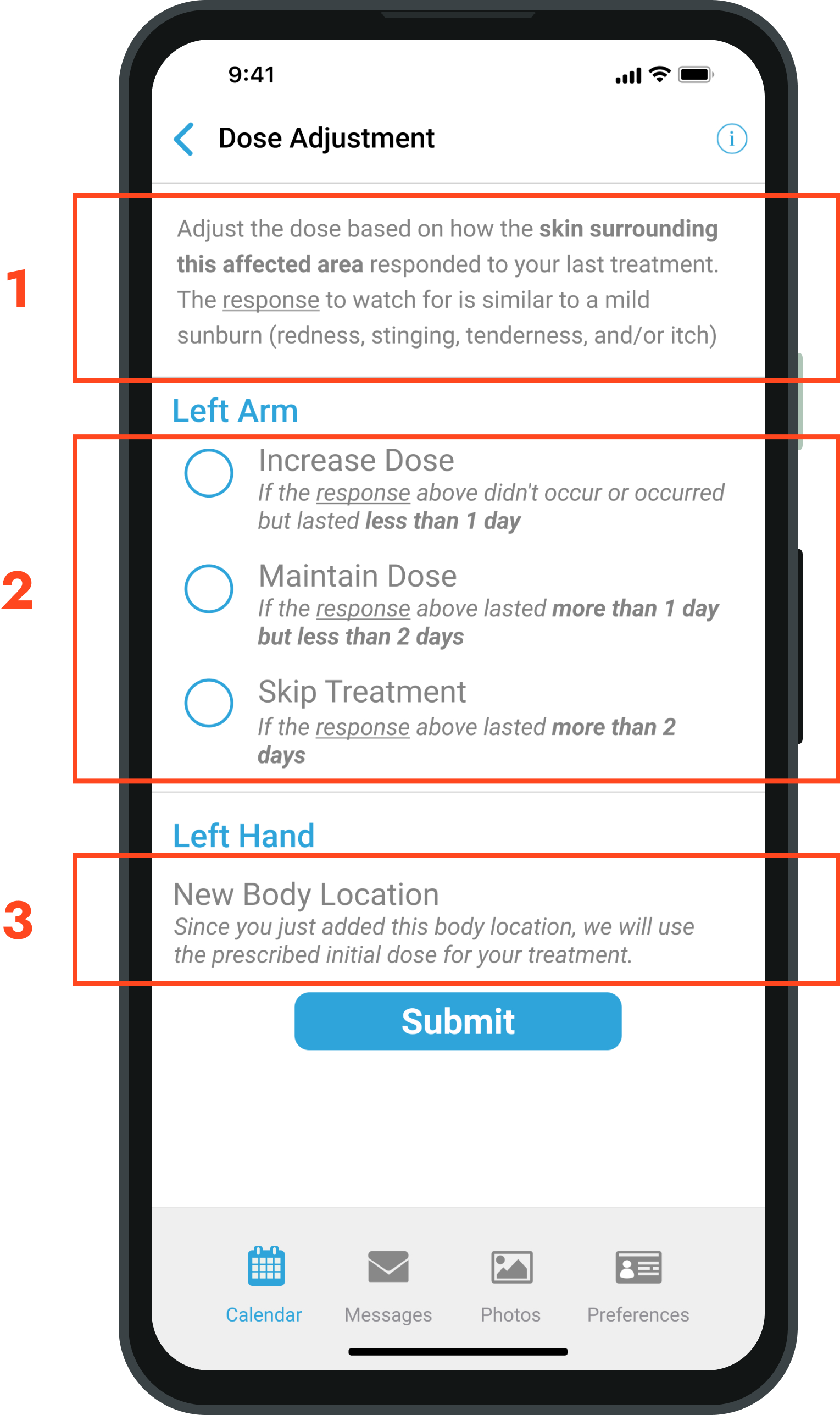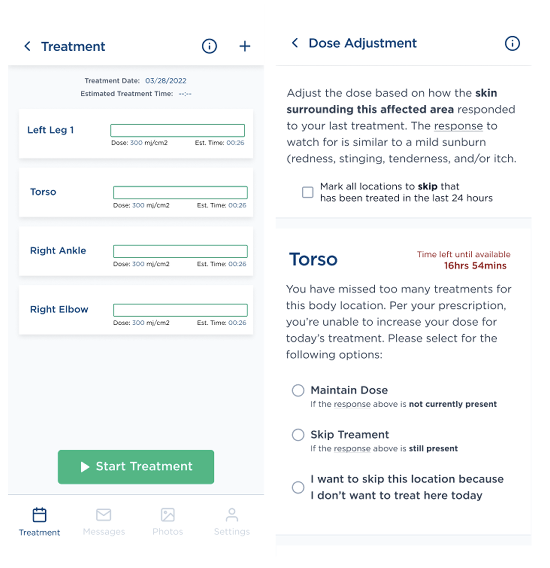 Patients can identify body parts that have a skin condition they want to treat, and then visit this feature when it comes time to treat to know the dose and how long to use the device.