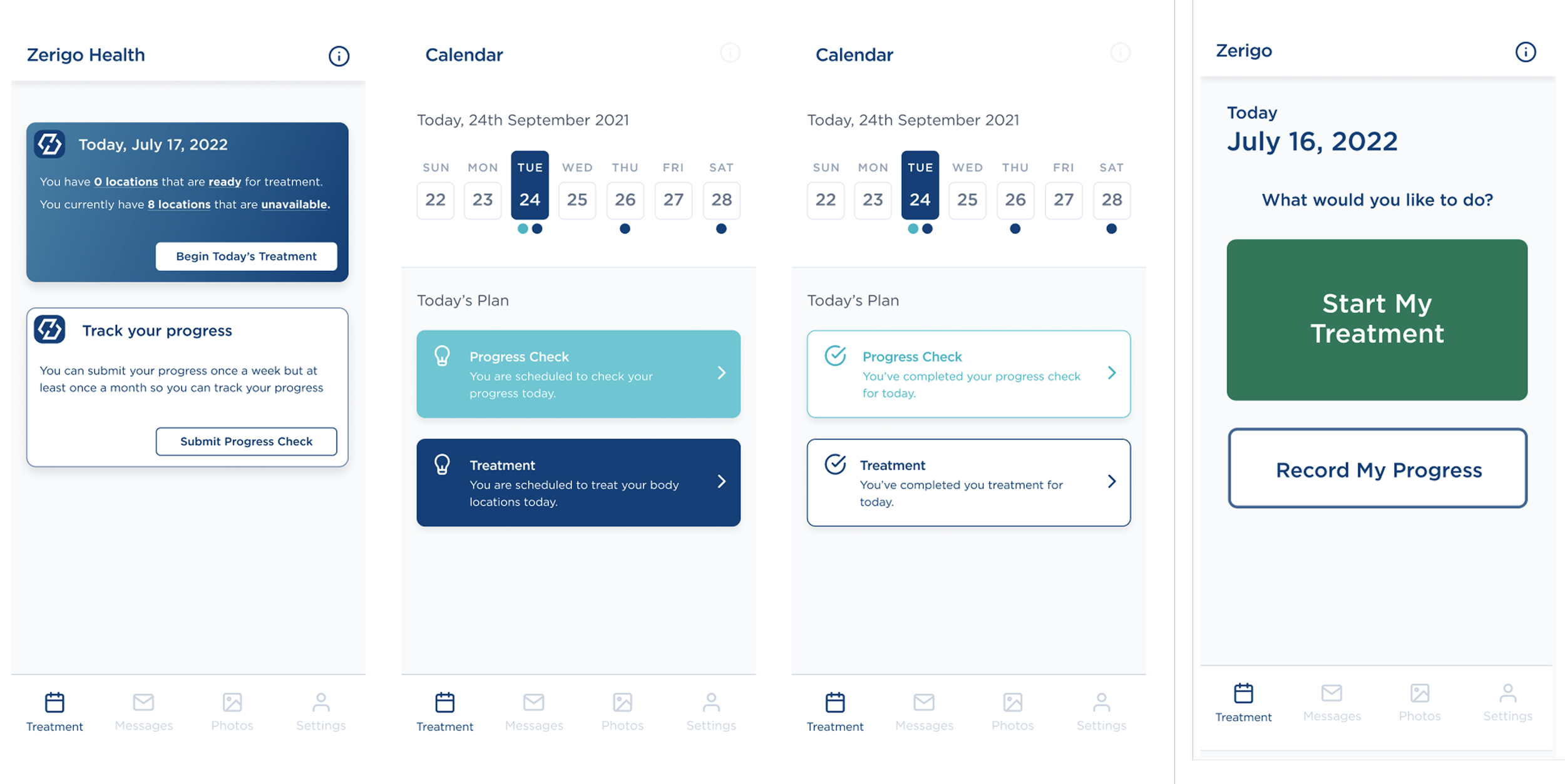 Zerigo Health contracted a small design team to transform its mobile app for patients managing chronic skin conditions. By overhauling the app’s information architecture structure, visual design branding, and introducing new confidence-building features, we supported 20% higher treatment adherence and elevated the platform’s overall clarity and trustworthiness.